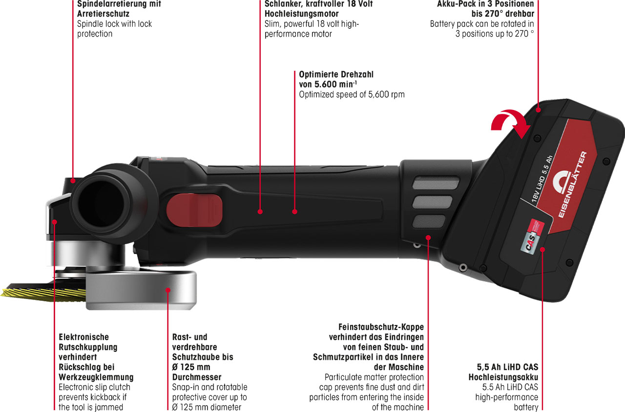 - Top-Hochleistungsbatterien 5,5 Ah (optional auch 8,0 Ah), in 3 Positionen bis 270° drehbar.