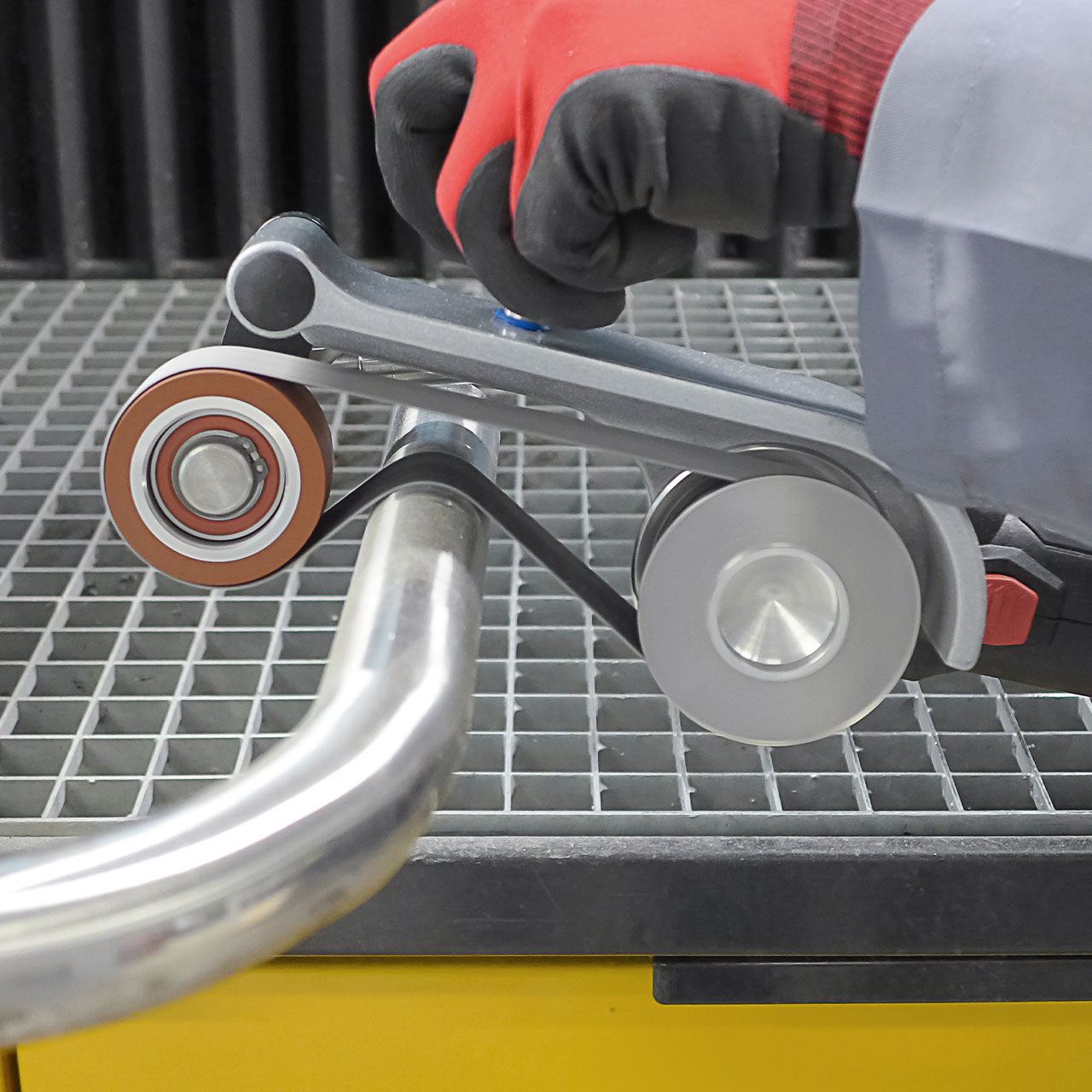 Jetzt mit variablen Drehzahlbereich von 550 bis 2.000 min-1 - ideal für alle Arbeiten an Rundrohren. Das kabellose Rohrband-Schleifgerät mit der Kraft stromgebundener Maschinen. Perfekt auf Baustellen, Werften (z. B. Reling-Bearbeitung), Geländerbau und vieles mehr!