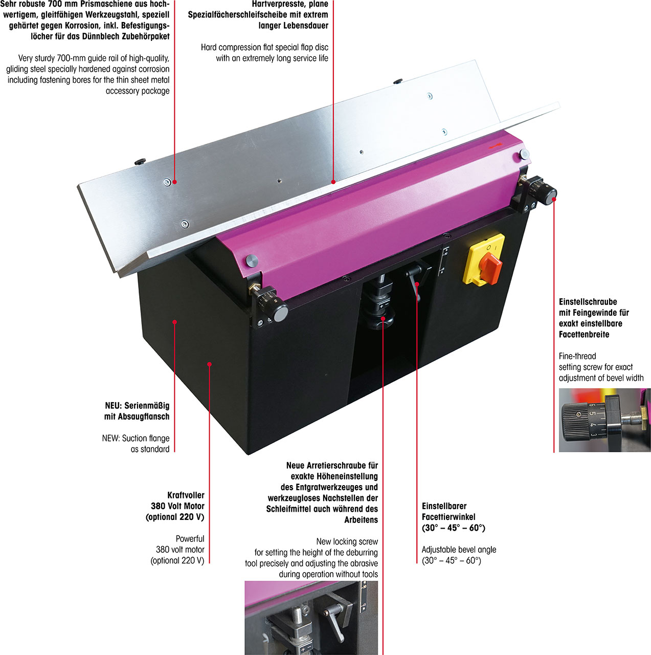 Sehr robustes, hoch präzises Entgrat- und Facettiergerät für sämtliche Metalle von Edelstahl bis Aluminium. Einstellbarer Facettierwinkel und stufenlos einstellbare Facettenbreite (exakte Einstellung mittels Rändel-Teilung).