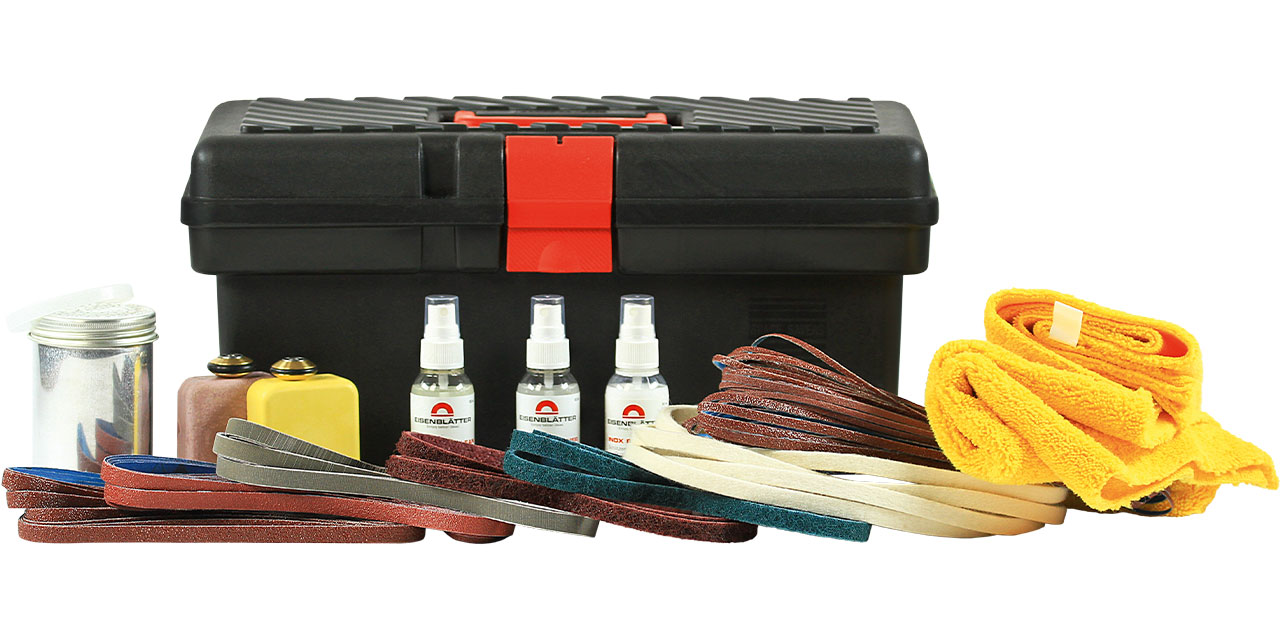 Mit dem BAND-IT Zubehörset sind immer die richtigen Werkzeuge zur Hand. Die ideale Ergänzung zu Ihrer Maschine. Geeignet für viele Aufgabengebiete wie Grob- und Feinschliff (Industrieschliff) bis zum perfekten Spiegelglanz – alles im stabilen Transportkoffer sicher verstaut.