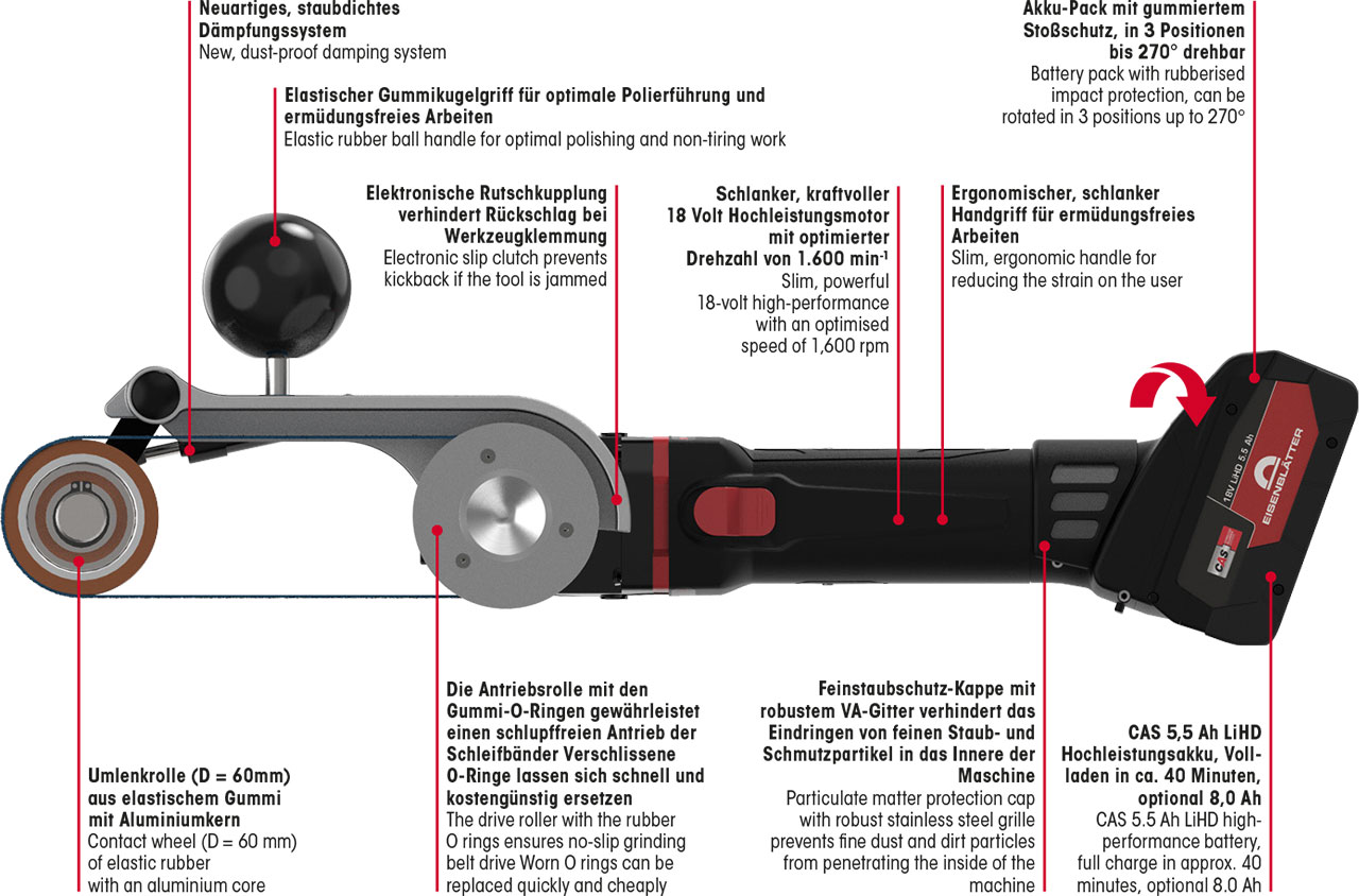 The ideal, cordless pipe belt grinder, with the power of current-bound machines thanks to planetary gears. Perfect on construction sites, shipyards (e.g. railing processing), railing construction and much more!