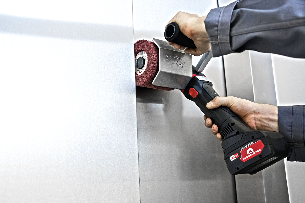 - Balanced, straight-line control without support rollers. This allows the tool to be freely adjusted (oscillation effect), ensuring highly decorative surfaces in satin and matt finish and industrial grinding without shadows or transitions.