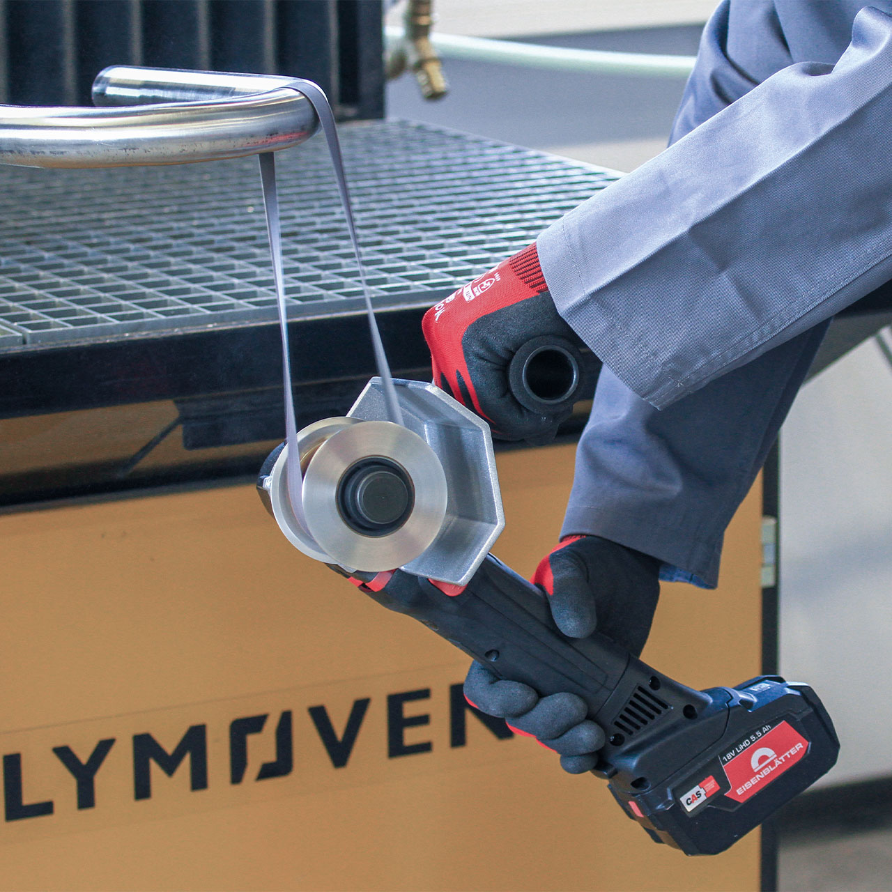 The machine offers a constant speed of 1,600 rpm. This is ideally suited to most tools, such as fleece, mix, and flop wheels, expansion rollers with sleeves, brushes, and much more. It is also suitable for pipe machining thanks to an optional grinding belt roller. The complete accessories for conventional linear grinders such as POLY-PTX® 802 can be used cordlessly with the revolutionary POLY-PTX® AKKU HT.