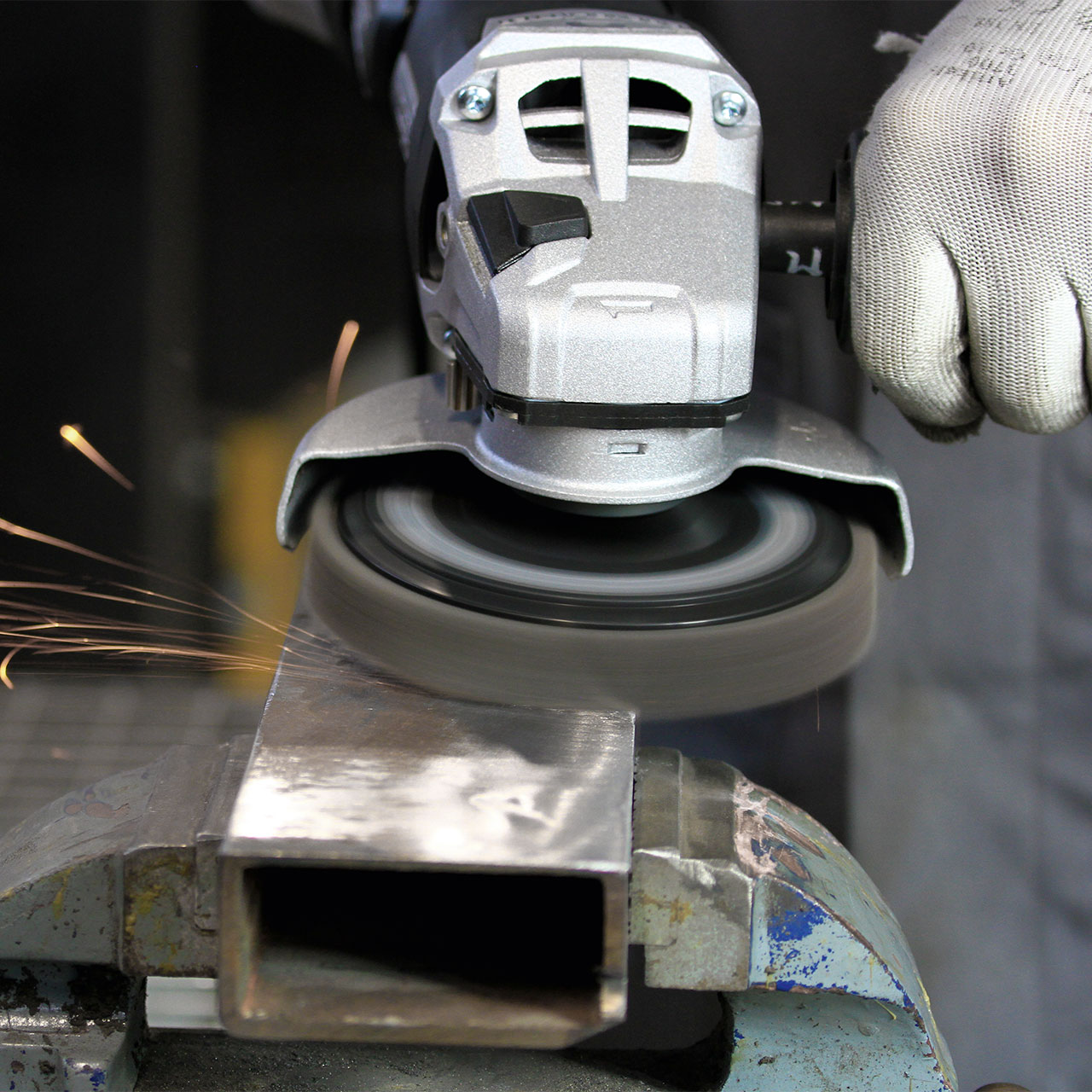 Cleaning discs for quick and thorough descaling, derusting and deburring. With intermediate layers of abrasive flaps for a stronger cleaning effect than conventional cleaning discs in just one step. They are also ideal for removing zinc thickenings, drips and zinc spikes after galvanizing, and for roughening the surface for a subsequent powder coating. Due to the open, elastic fabric pores of the CLEAN material, the grinding wheel does not become clogged and achieves a "sandblasting effect" on metal.