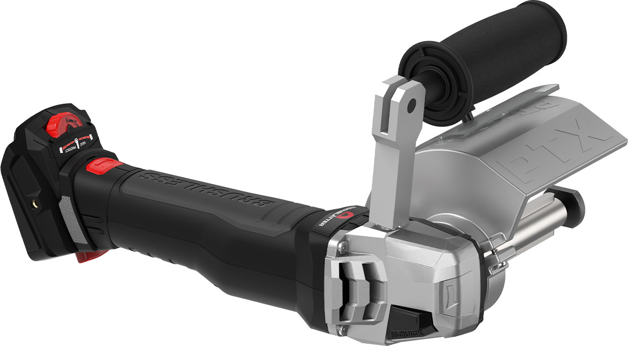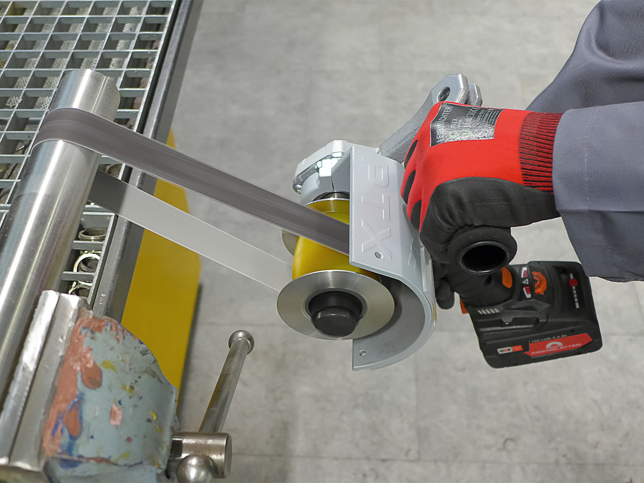 Now with a variable speed range from 550 to 2,000 rpm. Thanks to the planetary gear and the high torque, the POLY-PTX® AKKU BRUSHLESS can be used for all work involving power-driven linear grinders. Due to the variable speed, all POLY-PTX® tools can now also be used on the POLY-PTX® AKKU BRUSHLESS, including the optional grinding belt roller with belts for pipe processing and the extra-wide 150 mm grinding wheels.