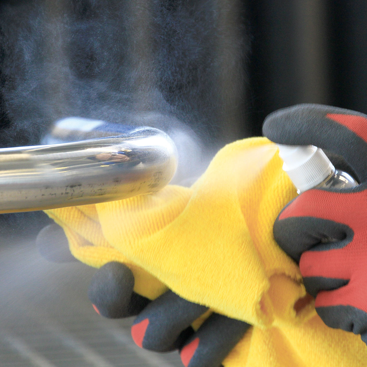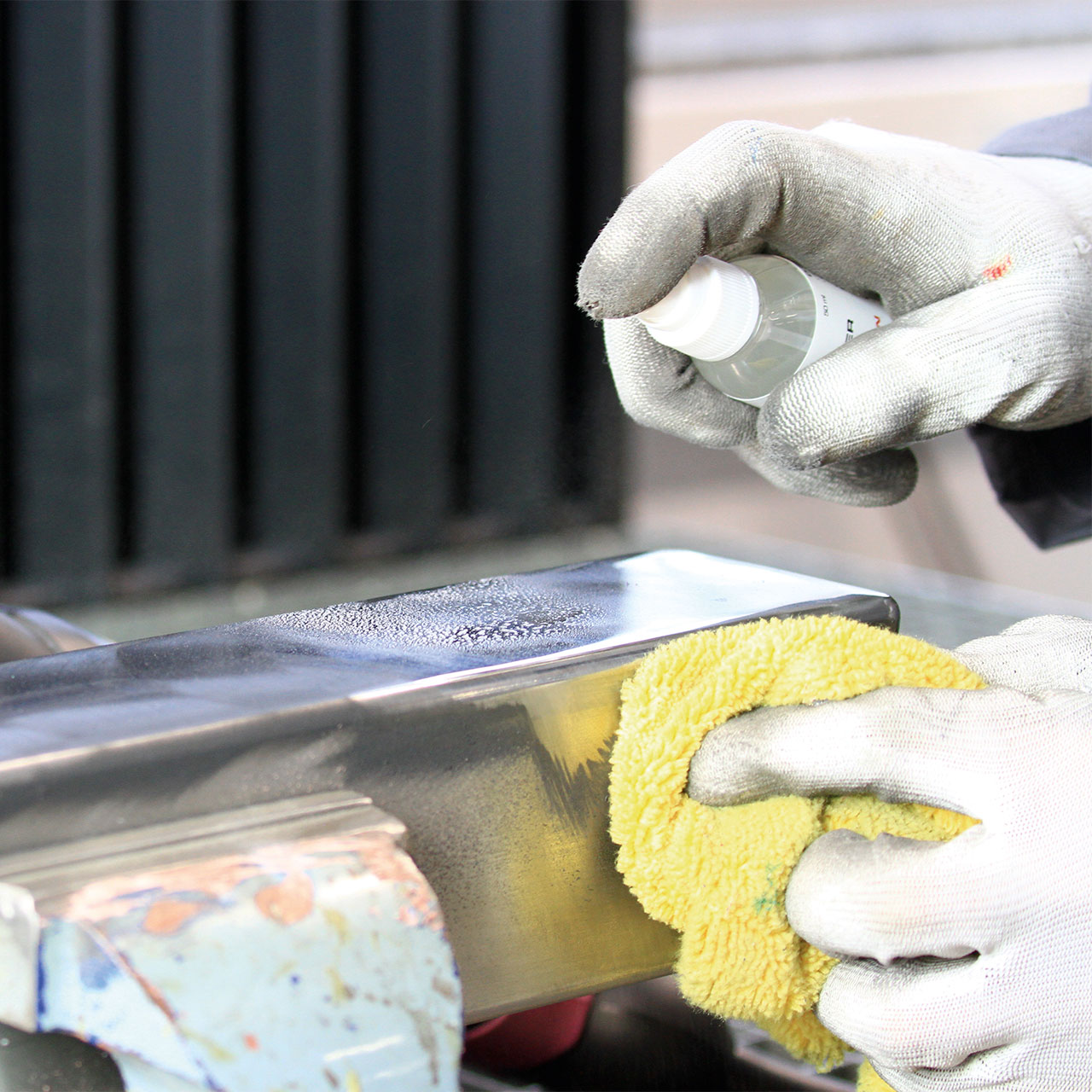 Zur finalen Oberflächenversiegelung wird mit dem INOX PROTECT eine transparenter Hartwachs-Schicht aufgetragen, die Metalle langfristig vor Fingerabdrücken und Flecken schützt.